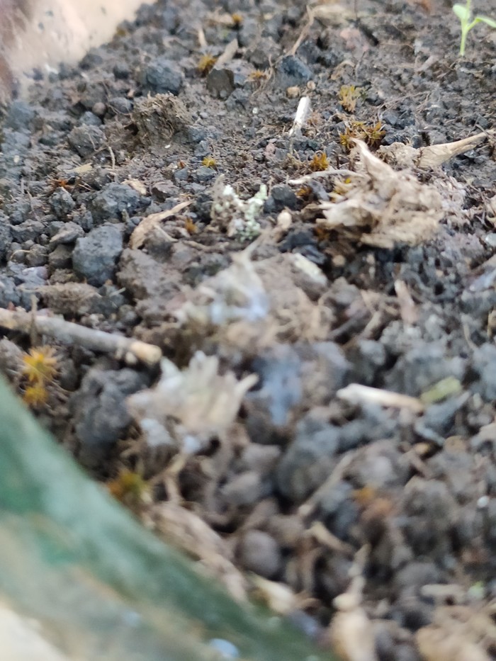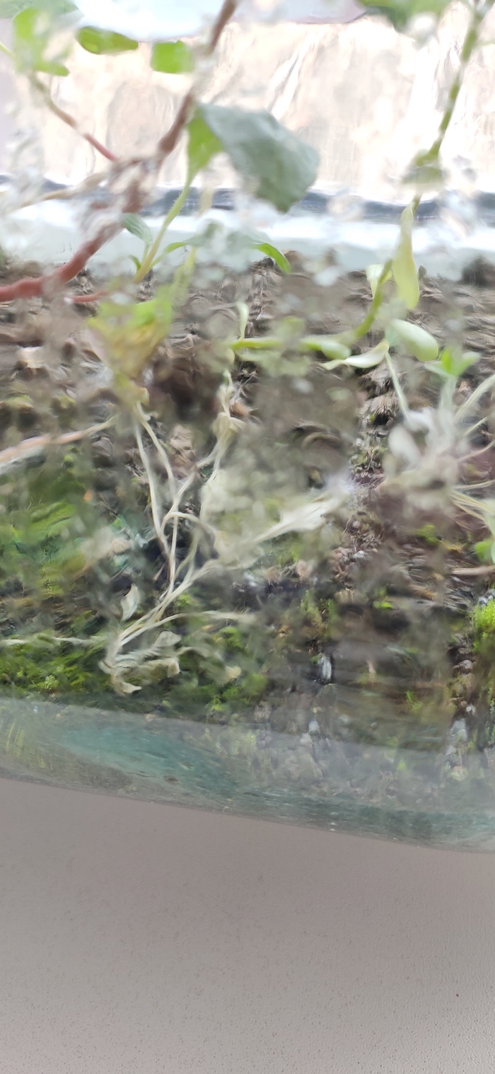 Вот, как плесень проявлялась. К сожалению, когда я начал просушивать террариум для части растений уже было слишком поздно. Это моё первое серьезное вмешательство, но без него эксперимент был бы завершён уже сейчас.