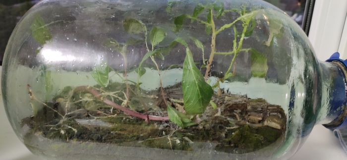 Еще у меня есть открытая бутылка с мхом и плющем. Мох, к сожалению, засох месяца через 3-4 ,но поначалу из него даже выростали грибочки, аж два вида и жил слизень)