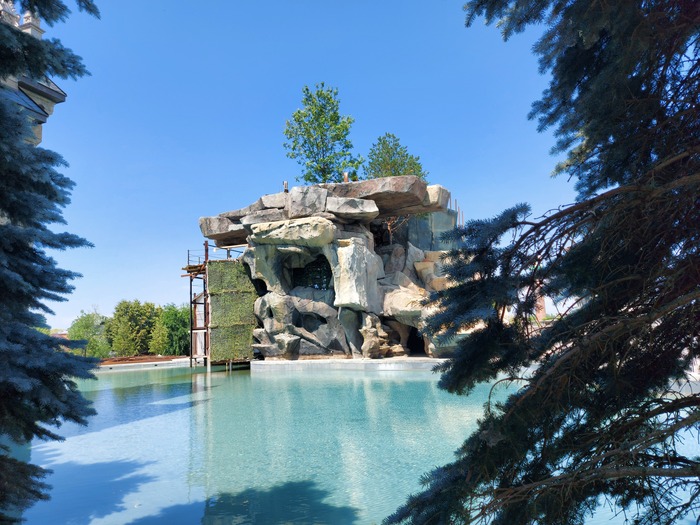 Большой сквер с фонтанами и скульптурами, пляж, рестораны, конюшня и собственный причал.