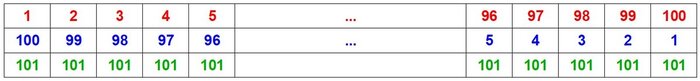 Сложим числа на верхней и нижней карточке «по столбцам». Смотрите! В каждом столбце у нас получается одно и то же число: сто один! Один плюс сто, два плюс девяносто девять, три плюс девяносто восемь – везде ровно сто один!