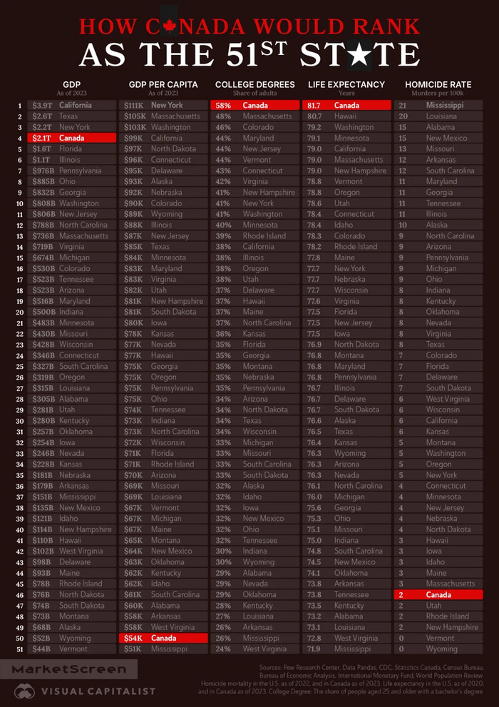 ▪️ По объему ВВП Канада уступает только Калифорнии, Тексасу и Нью-Йорку. Однако в расчете на душу населения ВВП Канады выше только Миссисипи.