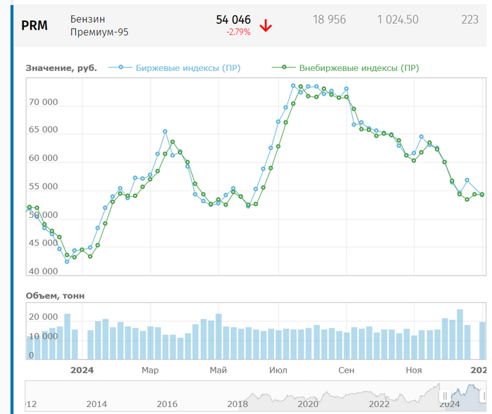 — Говорят, в тонне Аи-95 1333 литра. Получается, на сегодня стоимость литра на бирже – 40,54 ₽. Графики ниже.