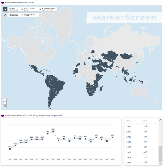 Россия поднялась в рейтинге силы паспортов на 46 место.