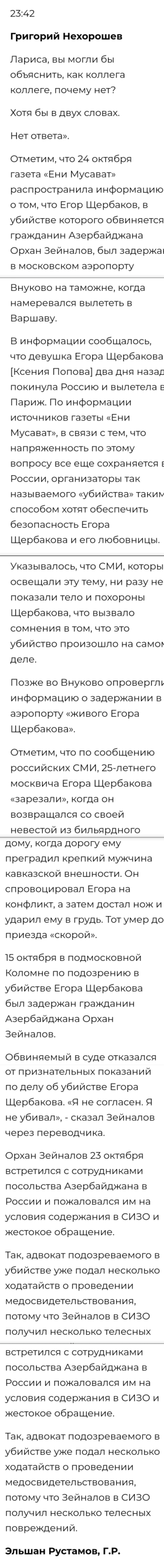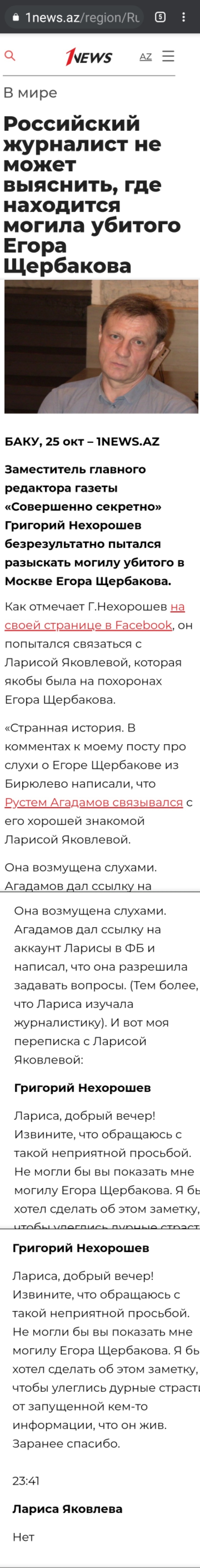 Заместитель главного редактора газеты «Совершенно секретно» Григорий Нехорошев безрезультатно пытался разыскать могилу убитого в Москве Егора Щербакова. Как отмечает Г.Нехорошев на своей странице в Facebook, он попытался связаться с Ларисой Яковлевой, которая якобы была на похоронах Егора Щербакова. «Странная история. В комментах к моему посту про слухи о Егоре Щербакове из Бирюлево написали, что Рустем Агадамов связывался с его хорошей знакомой Ларисой Яковлевой. Она возмущена слухами. Агадамов дал ссылку на аккаунт Ларисы в ФБ и написал, что она разрешила задавать вопросы. (Тем более, что Лариса изучала журналистику). И вот моя переписка с Ларисой Яковлевой: Григорий Нехорошев Лариса, добрый вечер! Извините, что обращаюсь с такой неприятной просьбой. Не могли бы вы показать мне могилу Егора Щербакова. Я бы хотел сделать об этом заметку, чтобы улеглись дурные страсти от запущенной кем-то информации, что он жив. Заранее спасибо. 23:41 Лариса Яковлева Нет 23:42 Григорий Нехорошев Лариса, вы могли бы объяснить, как коллега коллеге, почему нет? Хотя бы в двух словах. Нет ответа».