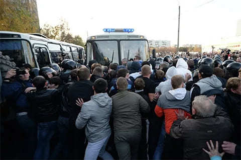 Участники акции бросали в сторону полицейских стеклянные бутылки и камни. Также сходились в рукопашную с представителями закона. В результате первых задержаний в автозаках оказалось 7 человек, однако толпа перекрыла движение полицейскому автомобилю, скандируя «Выпускай» и «Россия для русских!», и задержанные были отпущены.
