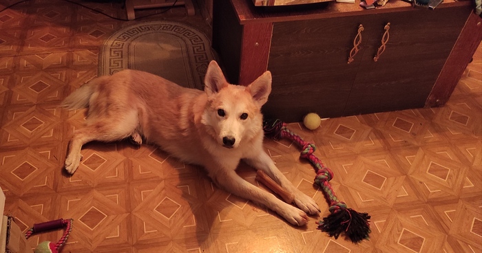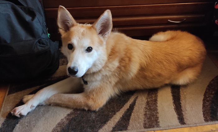 Расскажу немного про нашего пса. Он приехал к нам из приюта, из Курской области в конце лета. Это, насколько я поняла, западно-сибирская лайка или ее метис. Хвост ему откусили ещё в приюте.