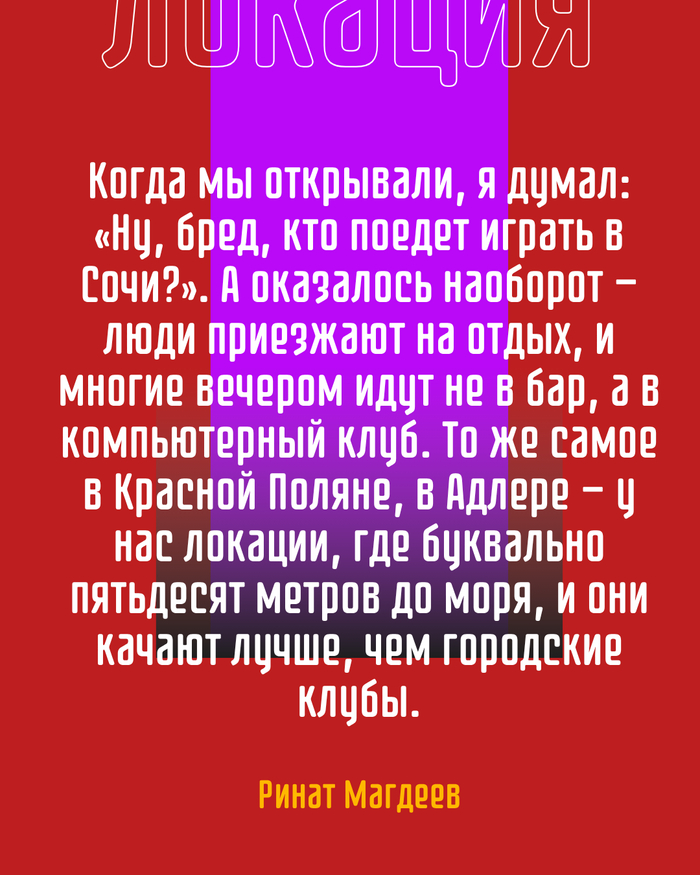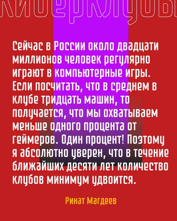 Ринат рассказал, как из стартапа на пять человек они выросли в сеть из 580 с лишним киберклубов, почему выручку теперь считают миллиардами и зачем вообще идти в компьютерный клуб, если у всех дома есть мощный ПК.