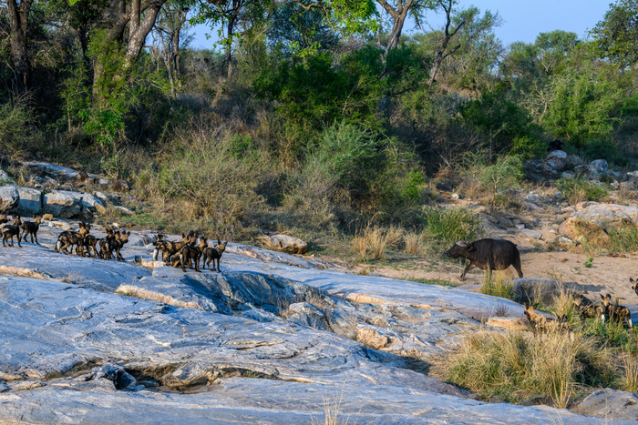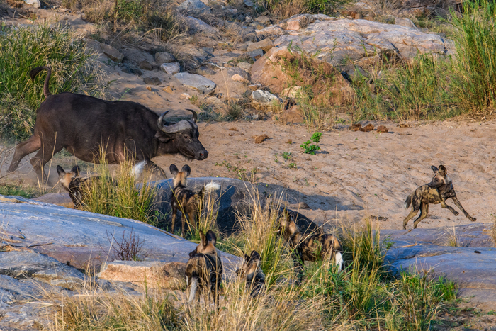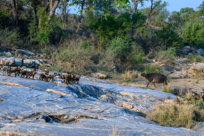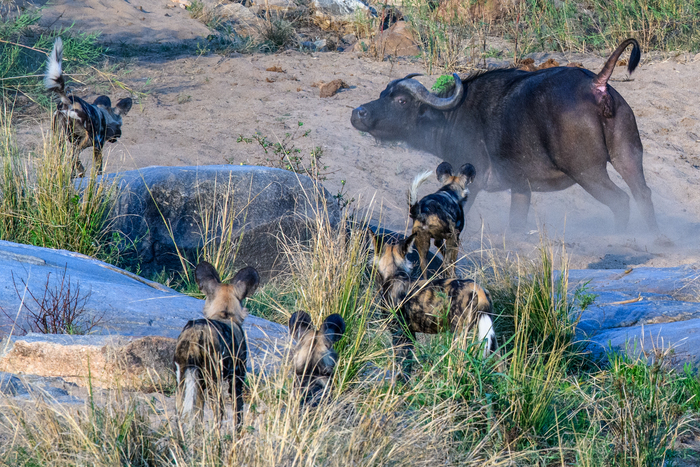 Это крупная стая примерно в 50 особей в Парке Крюгера, ЮАР. Они пытаются атаковать буйвола-одиночку (Daga boy).