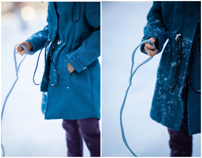 В дополнении образа я связала комплект из шапки, шарфа и варежек. Вязала из пуха норки - эта пряжа идёт комплектом моток (50 гр.) + бобинка (20 гр.); я вязала только нитью с бобинки. В работе использован крючок 0.6 мм. Масштаб варежек с линейкой на фото ниже:
