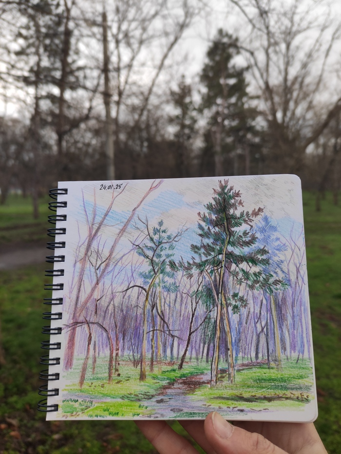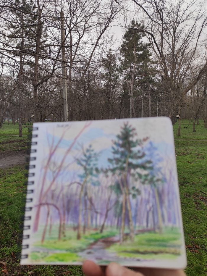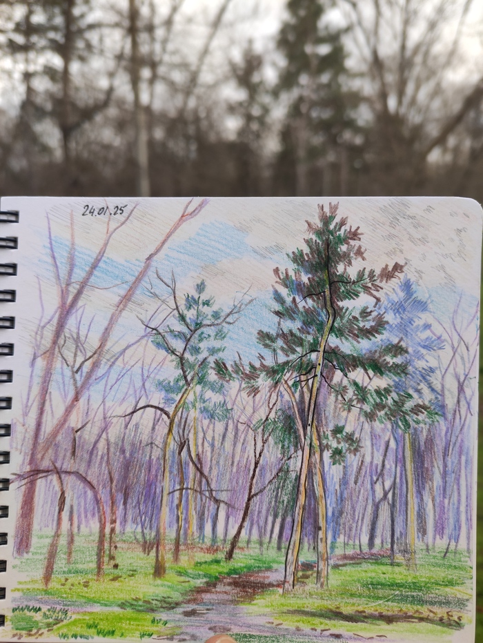 Сегодня взяла цветные карандаши, потому что мольберт устал и решил остаться дома. Нарисовала вот такой небольшой набросок.