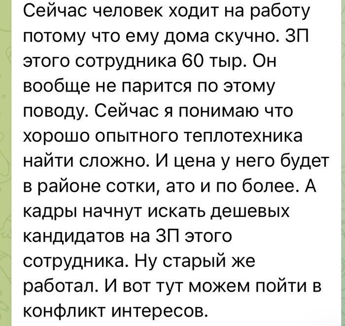 Прочитал в одном из производственных чатов «крик души» представителя такой компании. Они прекрасно понимают, что платят узкопрофильному профессионалу зарплату как минимум на 40% ниже рынка (потому что «да нах@й надо - все же и так за@бок»), но при этом одновременно задаются вопросом - как же быть, когда человек уйдет на пенсию - ведь замену ему за такую зарплату найти не получится…