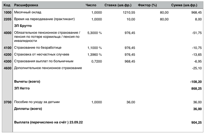 По зарплате получается примерно от 7 117 франков (633 тыс. руб) в месяц брутто (начинающий ординатор) и далее по возрастающей (поднимается с каждым годом ординатуры) + 13 зарплата. Так ординатор 6 года получает уже от 8 184 франка (порядка 730 тыс. рублей) + доплаты за дежурства (дежурств в среднем 5-6 в месяц, платят фиксированную часть 30 франков или около 2700 руб. за дежурство + доплата 7 франков за каждый ночной час с 8 вечера до 6 утра или за каждый час дежурства в выходной или праздничный день). После всех отчислений нетто-зарплата будет варьировать от 5 200 до 5 850 франков (463 - 521 тыс. рублей) на голую ставку без доплат за дежурства.
