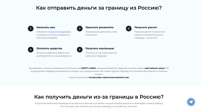 Вы заходите на сайт и переходите в Telegram-чат с менеджером.