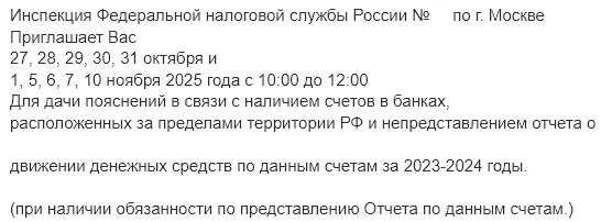 Получила сегодня от налоговой приглашение "для дачи пояснений в связи с наличием счетов в банках, расположенных за пределами территории РФ и непредставлением отчета о движении денежных средств по данным счетам за 2023-2024 годы (при наличии обязанности по представлению Отчета по данным счетам)."