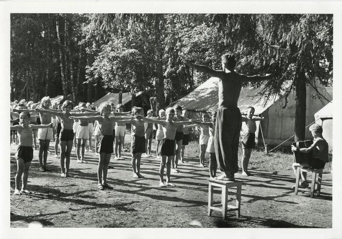 Во дворах стояли турники и деревянные брусья, в школах проводились физкультминутки, на предприятиях — производственная гимнастика. Радиоуроки зарядки ежедневно выходили в эфир, подстраиваясь под ритм всей страны.