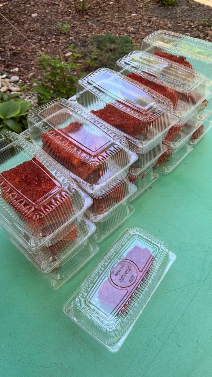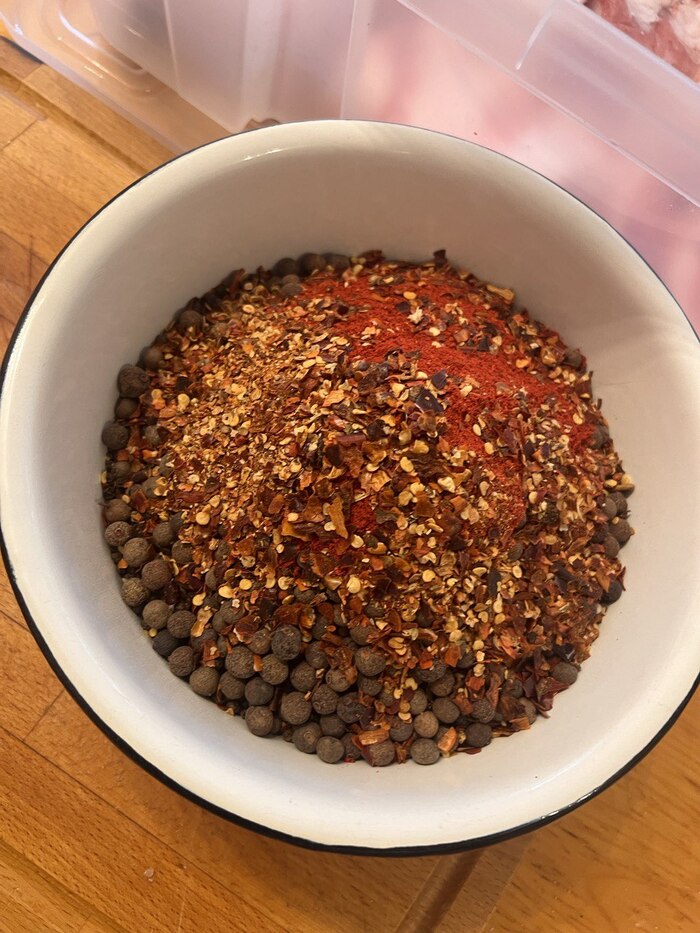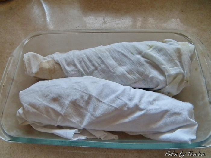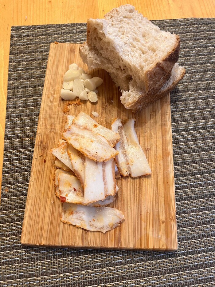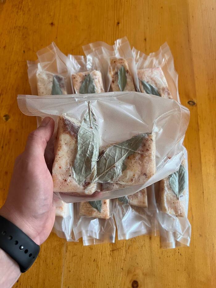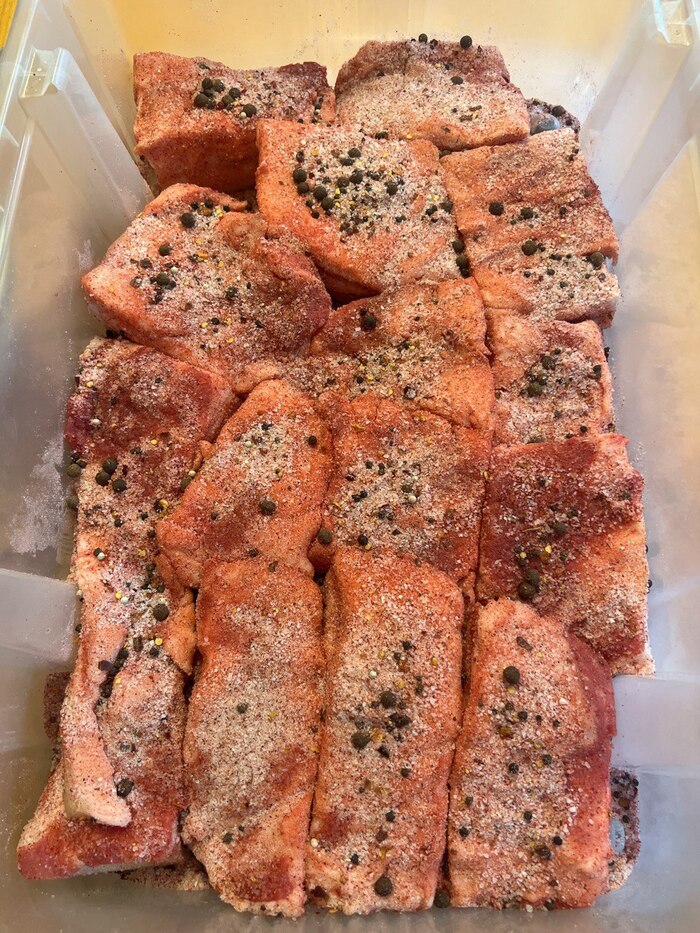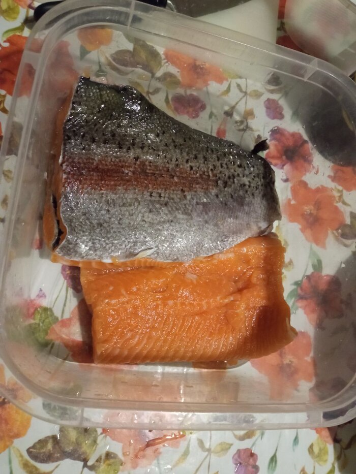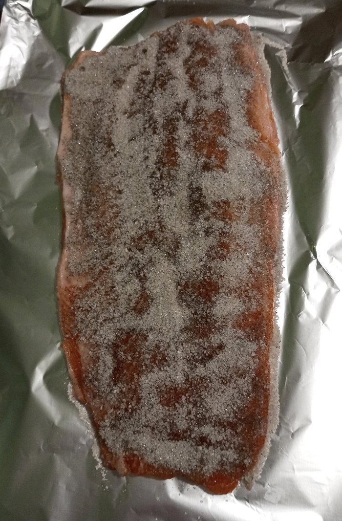 Солил сухим посолом. Сахар и соль 1:2, два филе поперёк пополам, ибо не влезало в тару, посолочной смесью натёр с обеих сторон, в пластиковый пищевой контейнер сначала один кусок, шкуркой вниз, потом второй, шкуркой вверх, потом остальные оба таким же манером. С утра перевернул в контейнере, пару часов назад достали, промыли — выступила влага, получился густой тузлук на мясе, и нарезали.