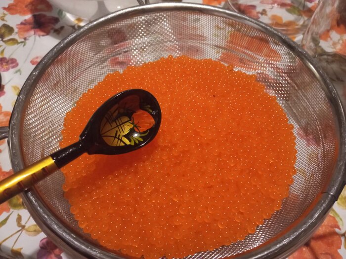 Потом, когда задолбался мешать всё это венчиком, когда на нём перестали налипать комочки слизистой плёнки с икринками, сливаем воду через дуршлаг и заливаем икру тузлуком, три столовых ложки соли без горки на литр. Солим 15 минут — готово. Мне икра показалось слишком солёной, я потом ещё вымочил в пресной кипячёной холодной воде 10 минут. В итоге получил отличный продукт, без горечи, слабой соли, с удивительно свежим вкусом! Не липкая, рассыпчатая, в этом небольшой минус — сваливается с бутерброда с маслом, если много положить =)