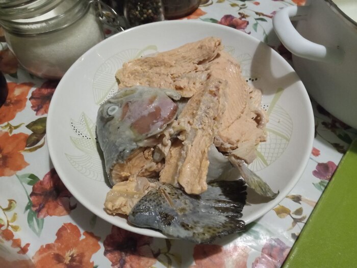 Солили вчера, вчера же варили бульон, сейчас, после рабочего дня, довариваем уху, заложив в бульон лаврушку, перец, целую надрезанную луковицу и крупно порезанные морковь и картошку. Запахи на кухне умопомрачительные!