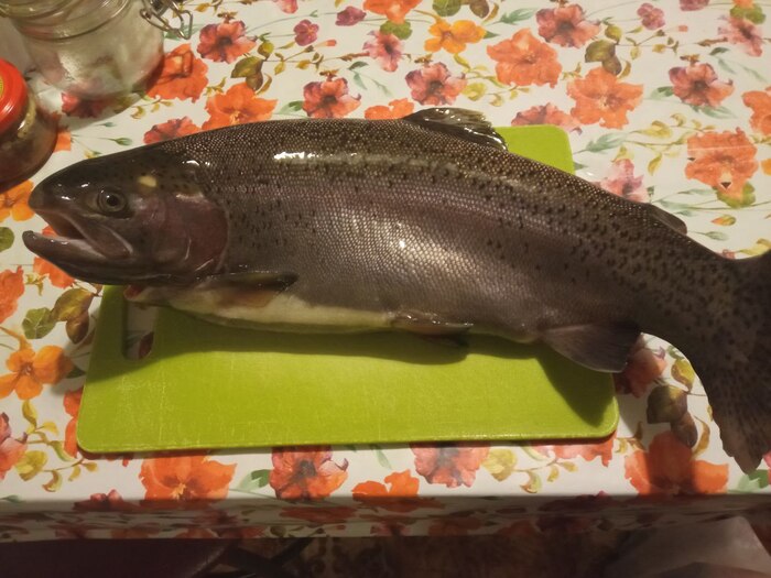 Ну и загорелся мыслью повторить, уж больно заманчиво. Пока собирался да тележился — сезон подходит к концу, но успел таки найти да заказать. Вчера вот ездил забирать через пол-Питера, у продавцов ферма на севере Ладоги, тут продают с квартиры, в подъезде очередь. Выбрал две рыбины, суммарно на 4,5 кг вышло, 4080 рублей. Толстенькие такие рыбные дамы, пёстрые — мозаично тёмными и белыми пятнами расцвечены, свежак!