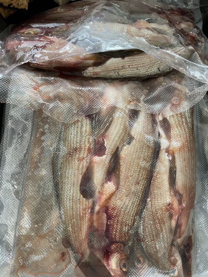 Пока я возился с икрой, жена напластовала рыбу на филе. С одной рыбы филе засолили, со второй — просто заморозили на жарку. Хвосты, обрезь и головы пошли на уху, половина; вторая половина тоже в заморозке.