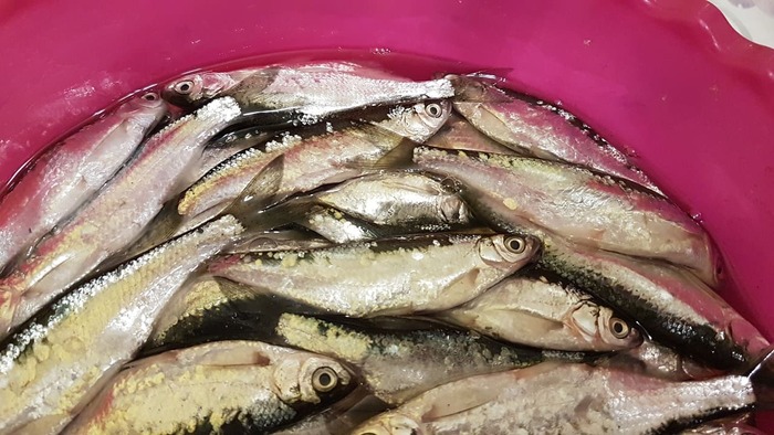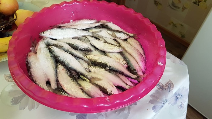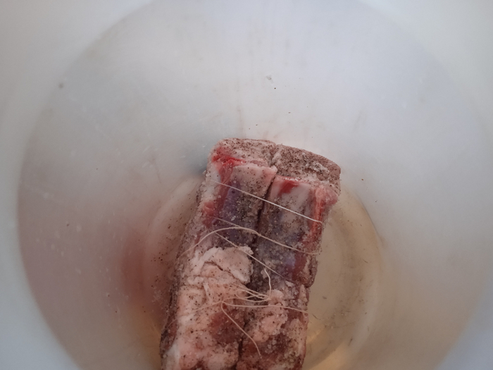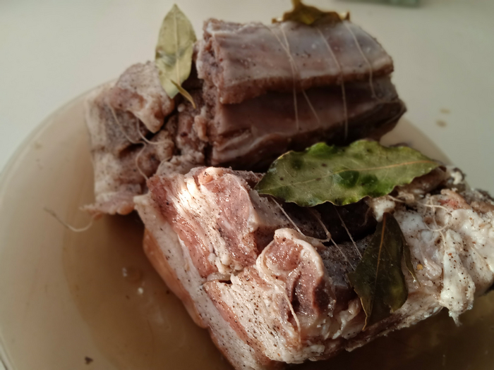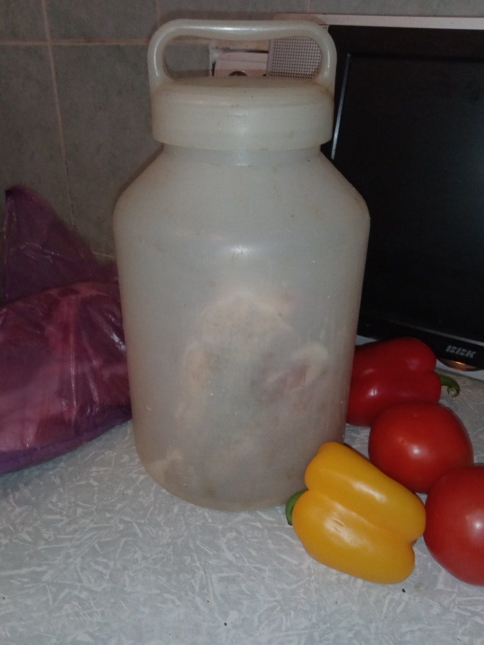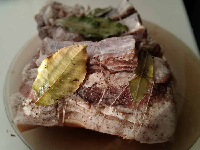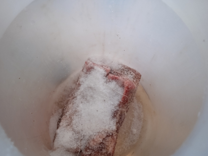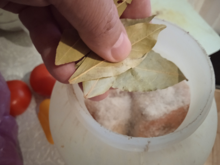 Для шашлыков и для засолки, у меня есть совковая канистра с большой горловиной, уложил засолку в нее, сверху лавровый лист и закрыл. Поставил канистру под стол для вяления на три, четыре дня.