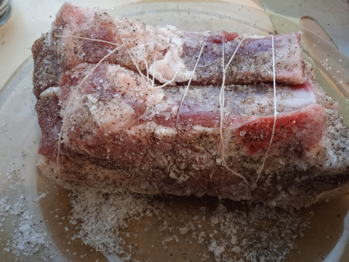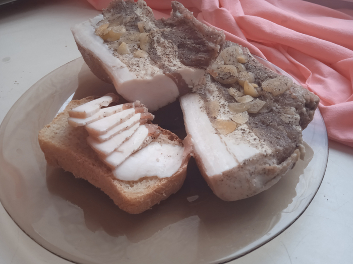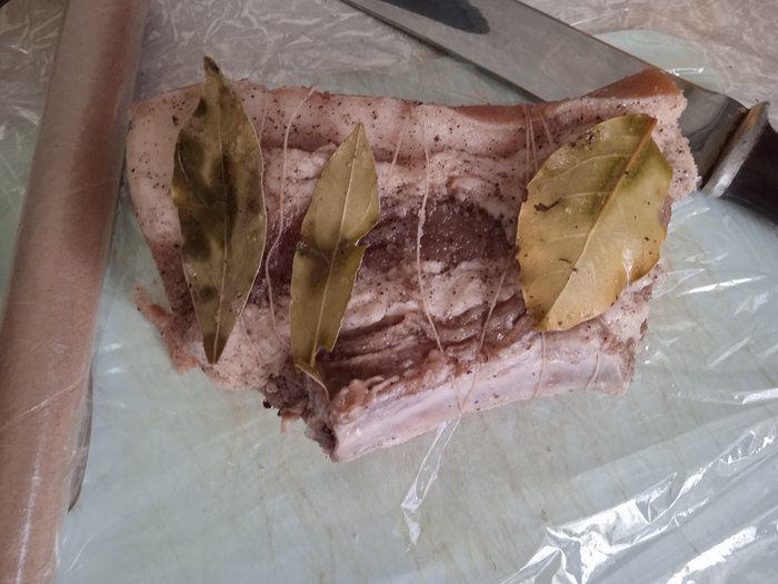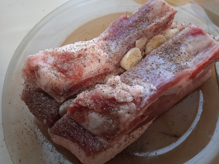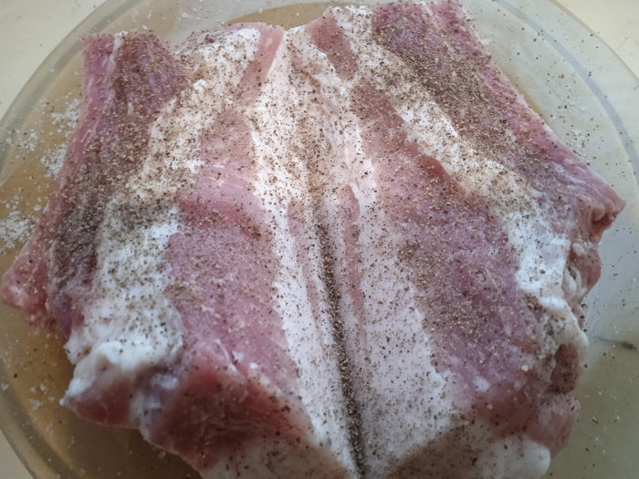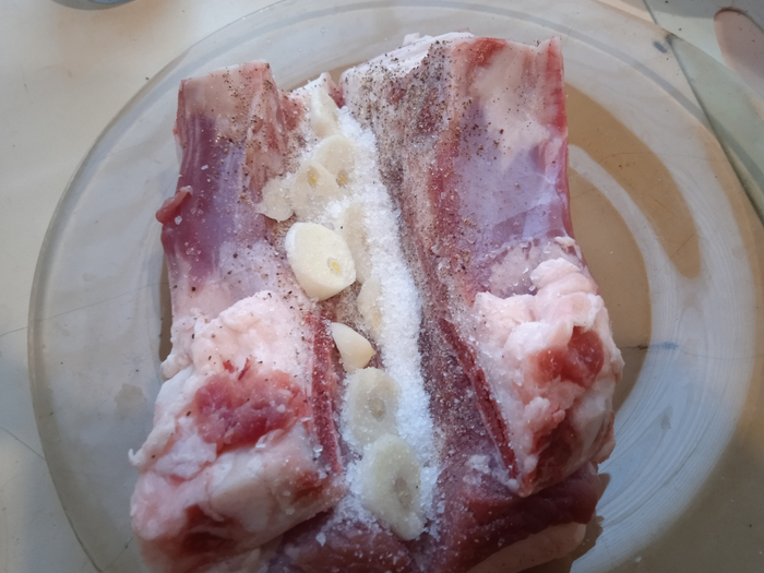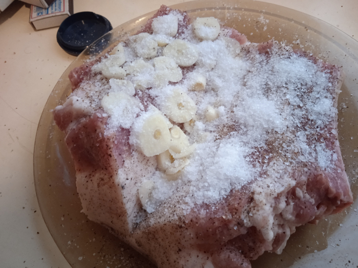 В принципе, не так сложно, промыл мясо, подсушил полотенцем, нарезал нужными кусками, осыпал перцем, положил чеснок нарезанный кругами, соль и остальное можно не жалеть, сало возьмет в себя сколько ему нужно.