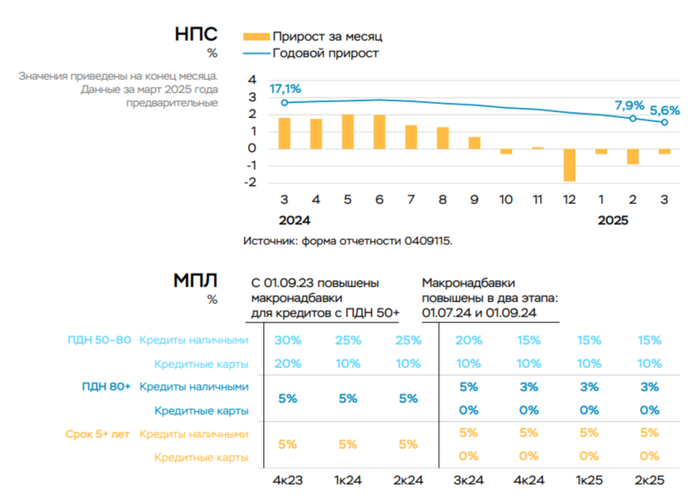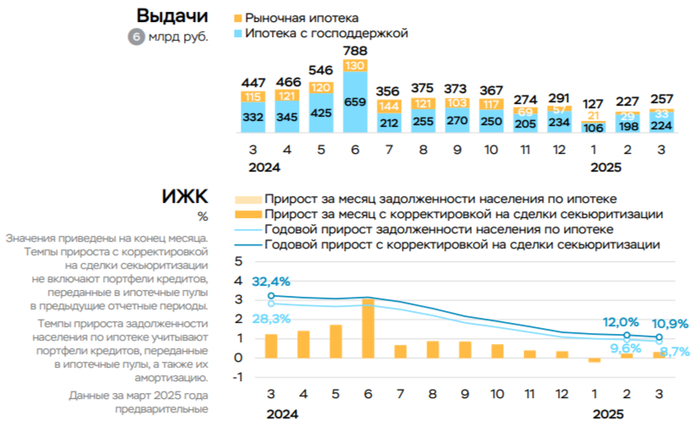🏠 Темпы роста ипотечного портфеля в сентябре увеличились на 1% (в августе 1,1%), кредитов было выдано на 404₽ млрд (392₽ млрд в августе), в сентябре 2024 г. выдали 373₽ млрд. Выдача ипотеки с господдержкой составила 313₽ млрд (320₽ млрд в августе), почти вся выдача приходится на семейную ипотеку — 271₽ млрд (в августе 278₽ млрд). Рыночная начала оживать — 92₽ млрд (73₽ млрд в августе), конечно, это не уровни прошлого года (103₽ млрд), но уже близко, снижение ставки не проходит бесследно. В сентябре второй месяц подряд выдачи в ипотеке превышают прошлогодние, это связано с различными смягчениями и отменами комиссий, так же с 07.08.25 по 01.11.25 был увеличен уровень возмещения банкам на покупку квартиры (в октябре есть вероятность снижения ставки, поэтому ждём продолжение роста). Недавно разбирал операционные данные ЛСР за III кв. там всё прекрасно, благодаря рассрочкам и снижению ставки.