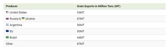 Во многом это связано с тем, что на Россию и Украину вместе приходится почти треть мировых поставок пшеницы. Пшеница является одной из наиболее часто используемых сельскохозяйственных культур в мире, из нее изготавливают различные продукты питания, такие как хлеб и макаронные изделия. Кроме того, Украина также является крупным экспортером кукурузы, ячменя, подсолнечного и рапсового масла.