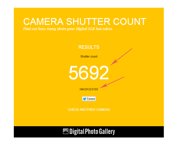 После загрузки снимка, Camera Shutter Count сразу же покажет счетчик сделанных кадров и модель камеры.