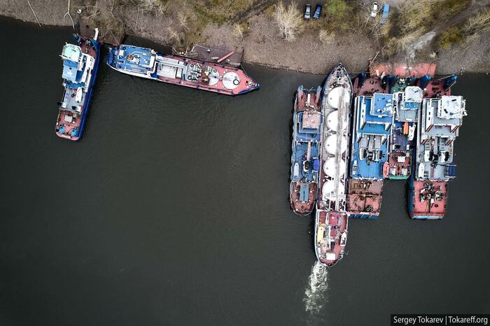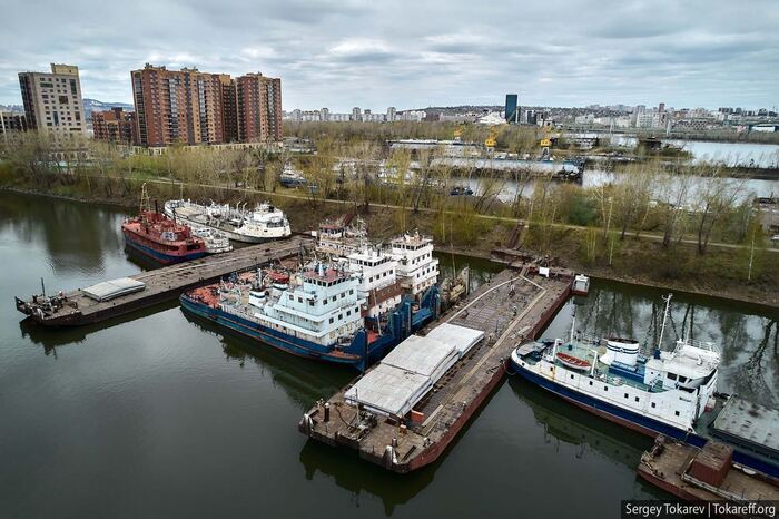 Это Красноярский судоремонтный центр. Сюда суда енисейского флота приходят на зимовку и тех.обслуживание. Один из старейших красноярских затонов. Насыпную дамбу на Абаканской протоке соорудили в 1909 году, чтобы прятать на зиму суда от льда. Красноярской ГЭС еще не было, и весенний ледоход создавал много проблем судовладельцам, повреждая или даже топя корабли.