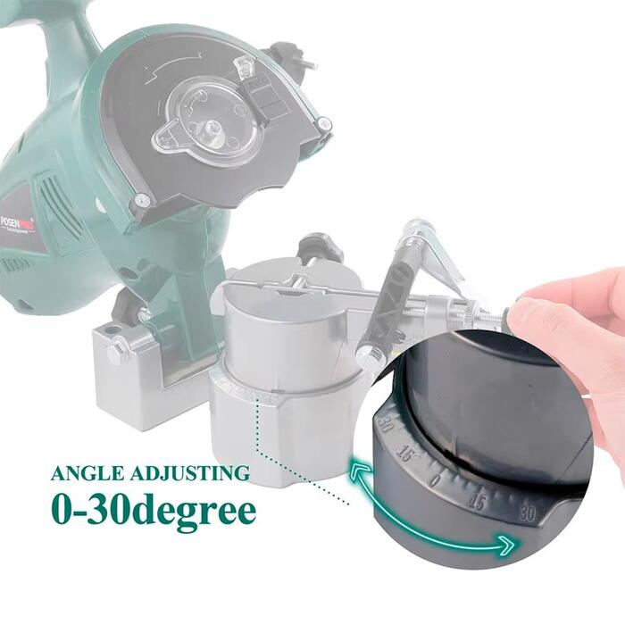 Электрическим станком POSENPRO PGSS250, мощность электрического мотора которого 250 Ватт, в бытовых условиях можно проводить заточку цепных пил. Двигатель работает от сети переменного тока (~ 50/60 Гц) номинальным напряжением 220-240V. Максимальная скорость вращения заточного круга — до 8400 об/мин. Размер круга: 100x10x3.2mm (Диаметр заточного круга х Посадочный диаметр х Толщина круга). Можно регулировать угол заточки в диапазоне от 0° до 30° и устанавливать глубину заточки. Имеется защитная крышка на круге для защиты глаз от искр. Устройство имеет Сертификат Евротест (СЕ, глобальная версия) и Европейский сертификат соответствия.