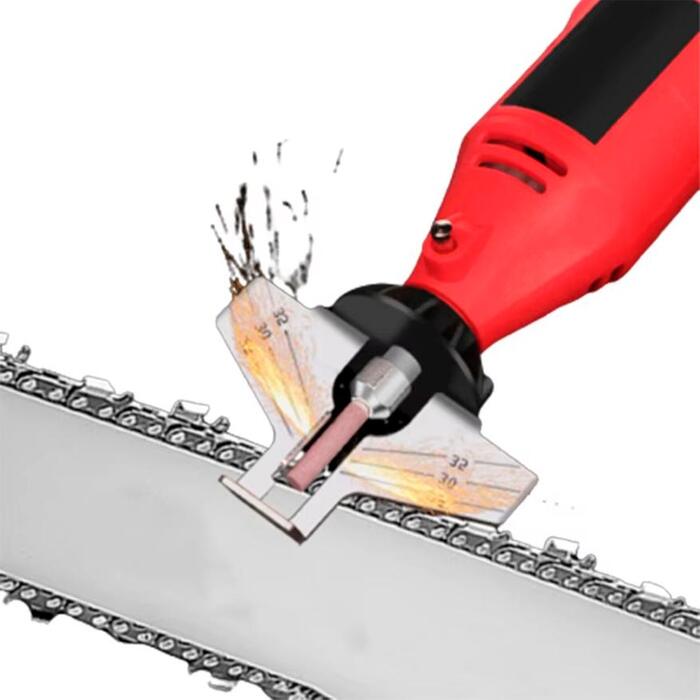 Заточная насадка (направляющая) обеспечивает лучший угол заточки, она легко навинчивается на электрическую шлифовальную машину, которая и позволит легко затачивать пильные цепи. Всё приспособление, по словам производителя, легко инсталлируется и деинсталлируется.