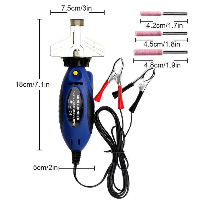 Портативная точилка, которой в случае необходимости можно заточить пильную цепь практически в любом месте. Удобно ею пользоваться даже в дороге, когда имеется доступ к автомобильному аккумулятору или другому 12 V источнику электрической энергии. Скорость вращения шпинделя этого устройства может достигать до 25000 об/мин, что позволяет быстро и эффективно затачивать цепи, экономя время и усилия.