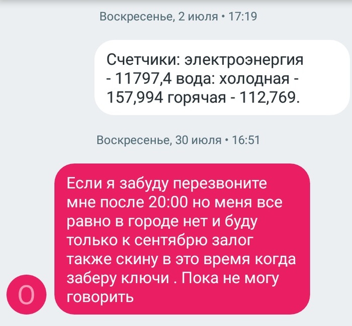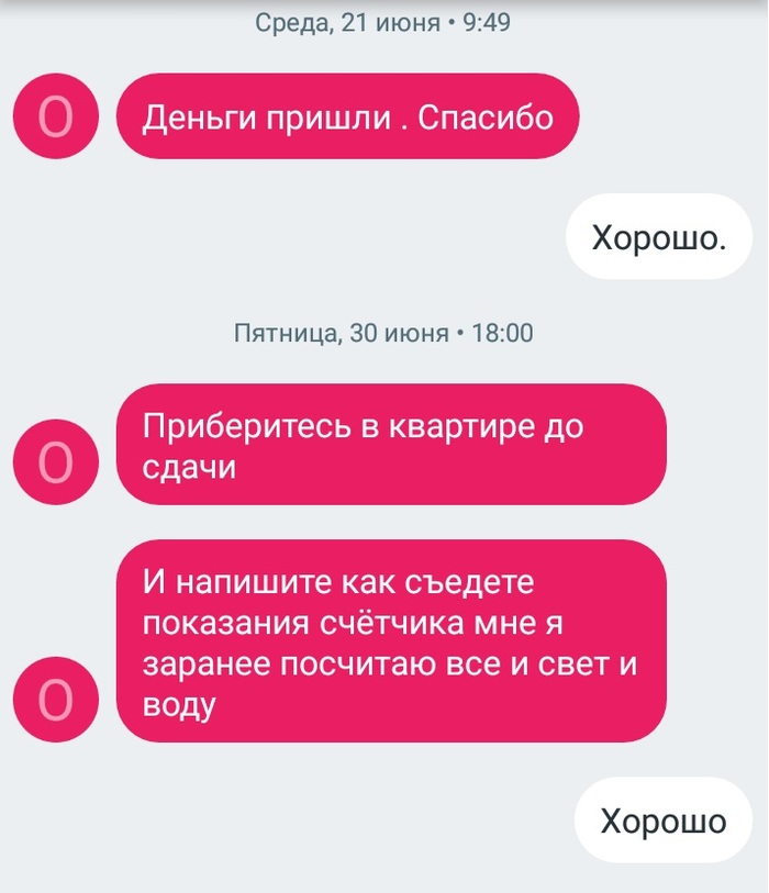 С 2014г. работаем в замечательном городе Тихвине, за это время снимали 7-8 раз квартиры для работников, отношения с людьми выстраивали нормальные, всегда шли на встречу(дабы потом, если вдруг, нам также помогли), и все бы не чего, но в 2017г. приключилась одна неприятная история, которая продолжается до сих пор. Сняли квартиру в конце мая, прожили 1,5 месяца в ней(заплатив как за 2), съехали и не получили обратно залог(равный месячной квартплате). Деньги не гигантские, но ощутимые. И вот прошло уже больше половины года, а хозяйка(проживающая в Санкт-Петербурге) все никак вернуть залог не хочет. Далее следует небольшая часть нашего смс-общения. Посмотрев на даты можно сразу понять что я ОЧЕНЬ не настойчивый человек))) О - это арендодатель. В начале рассчитывали сделать работу за 1 месяц, то есть до 27-го числа съехать с квартиры, но не успели и продлили еще.