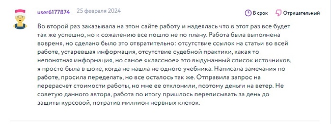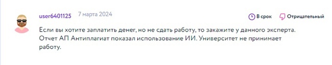 Если вы решили купить свою студенческую работу, а не написать ее самостоятельно, вы во первых, переплатите полную цену, во вторых - никто не гарантирует что после у вас не возникнут с этим проблемы. В третьих - вам спокойно могут написать ее с помощью ИИ, и тут как бы Автор 24 будет не особо против. Кроме того, вы по факту не можете гарантировать, что вашу работу не возьмет аккредитованное агентство, зарабатывающее на этом деньги, и не слишком гоняющееся за качеством работы. Были истории, когда заказчик несколько раз подряд попадал на разных контрагентов, и по итогу тратил и деньги, и время, и по итогу, не сдавала вовремя работу. Со всеми вытекающими для него после последствиями.