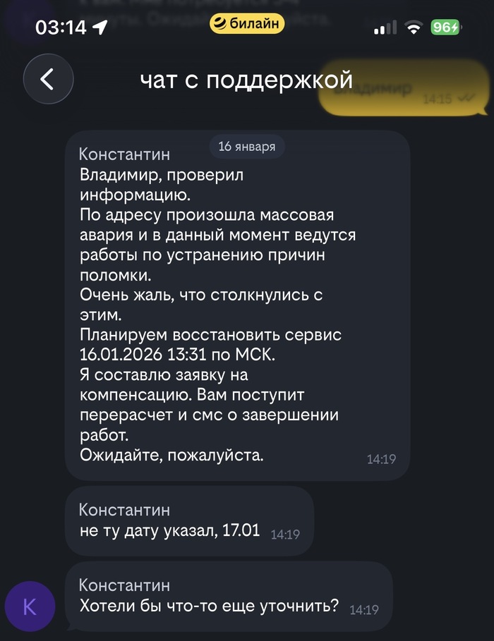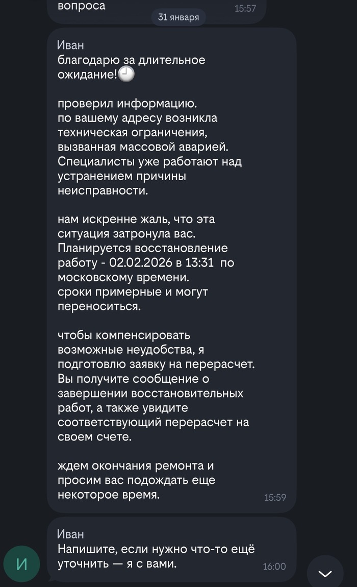 Даже на жалобы реагируют слабо. В телефонных разговорах так же говорят: "Ждите", но, к сожалению, при объяснении причин затягивания сроков добавляю ложь. К примеру, во время звонка от 09.02.2026 оператор сказала, что им не дают доступ в технические помещения Управляющая Компания нашего дома. Но проблема в том, что за пару часов до звонка пришел ответ от УК, что к ним никто не обращался с просьбами для доступа в тех.помещения.