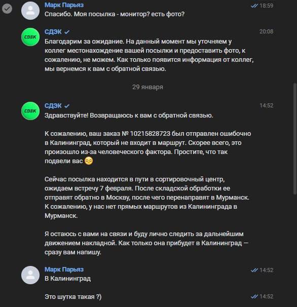 Герой этой истории — «потеряшка» монитор Zowie за 65 000 рублей, купленный на Авито с доставкой СДЭКом. Сама доставка обошлась мне в 6 400 рублей, всё как положено было застраховано. Но есть нюанс — вместо пункта назначения посылка почему-то уехала в Калининград. Ладно, думаю, бывает, подожду.