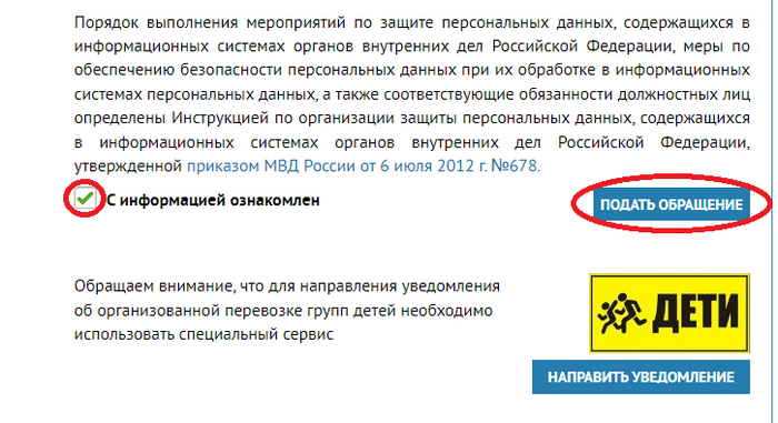 6. Говорим, что с информацией ознакомлены и нажимаем "Подать обращение"