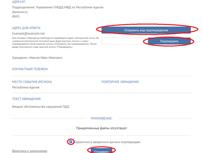 9. Нажимаем "Отправить код подтверждения", проверяем почту, вводим пришедший код подтверждения и нажимаем "Подтвердить". Затем проверяем, всё ли указали правильно, ставим галочку "Корректность введенных данных подтверждаю" и жмём "Отправить".
