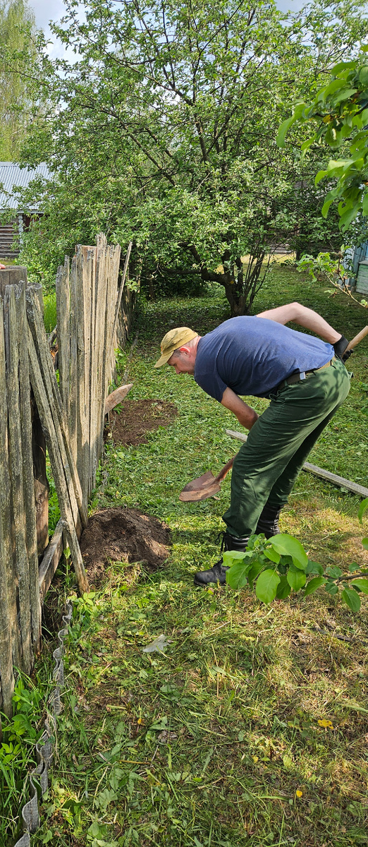 Ну и за два дня до нашего отъезда сложились звезды, Марс вошел в восьмой Дом и джентльмены приступили к ремонту забора. Ловко, быстро ,в 4 руки (плюс 4 лапки на подхвате мои и супруги соседа) с помощью лопаты, молотка и такой-то матери, забор встал на свое законное место.
