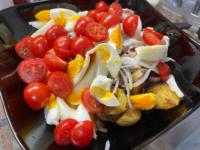 Нам требуется добыть, остатки отварной курицы, мелкий картофель вареный, шампики, лук, яйца вареные, помидор, яйца, зелень. Я названия салата не знаю, простите - но ел такое много раз. Деревенский вроде.