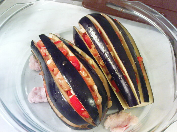 Бывшие горькие баклажаны промываем холодной водой, немного отжимаем и обсушиваем салфеткой. С баклажанами, как на фото никаких манипуляций кроме мытья, разрезов и фаршировки "чесночным луко-перцем" не требуется. Начиняем их луково-перечно-чесночной смесью и укладываем в жаровню.