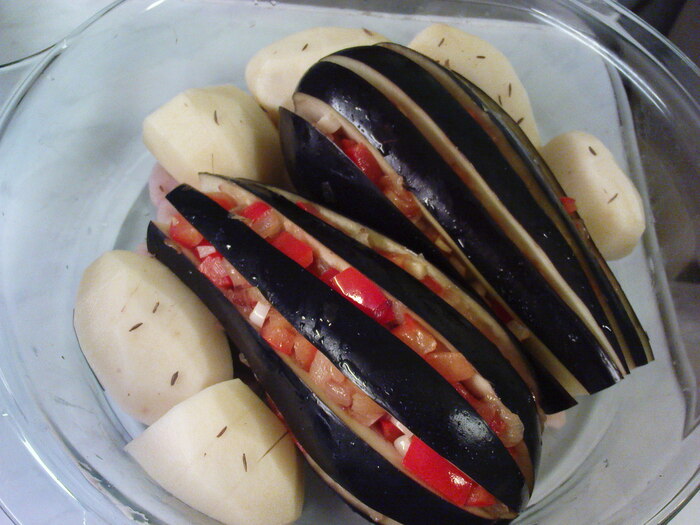 Картофелины надрезаем до середины, в 2-3 местах, и укладываем вокруг баклажанов, надрезами вверх. Солим, перчим и посыпаем щепоткой, растертой между пальцами, зиры. Как показал опыт, зиры в этом блюде много не бывает. Сыпьте щедрее, чем на фото!