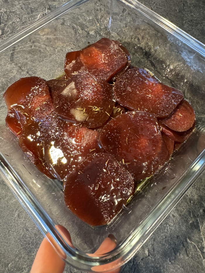 В глубокой посуде разложить свеклу слоями и полить маринадом. Убрать в холодильник. Чем дольше маринуется, тем вкуснее.