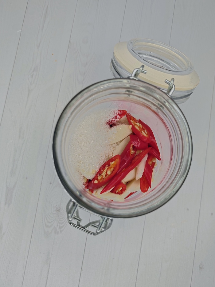 И вот теперь можно слить в кастрюлю маринад от свеклы и долить холодной водой. Если бы вода была комнатной температуры, на поверхности мог бы всплыть вытопившийся из колбасы жир, который потом будет очень неприятно оседать на губах. В суп добавляется половина столовой ложки уксусной эссенции, это которая 70%. Если так вышло, что воды вы доливали мало (ну вдруг хотите супчик погуще, или же огурец слишком водянистый был), добавляйте меньше и осторожнее. Размешиваете и пробуйте на соль и кислоту, кислинка должна быть лёгкая, а не скукоживающая физиономию, как лимон. Соль — имейте в виду — добавлять сложно, в холодной воде она растворяется плохо и медленно. Лучше остановиться, когда суп кажется слегка недосоленным.