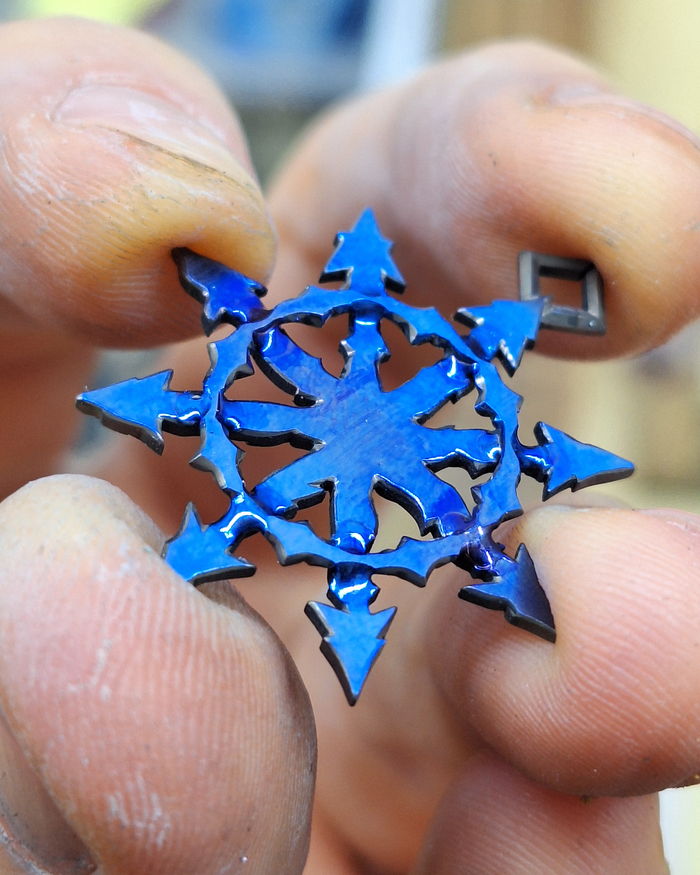 А теперь начинается Настоящий гемор! Мне необходимо очень аккуратно штихелями (это такие специальные резцы по металлу) очистить половину узоров от графитового цвета, чтобы в последствии я мог придать этим областям другой цвет. Сложность заключается в том, что мне нельзя задевать области которые должны остаться графитовыми, введь в случае ошибки придется переделывать всю звезду с нуля.