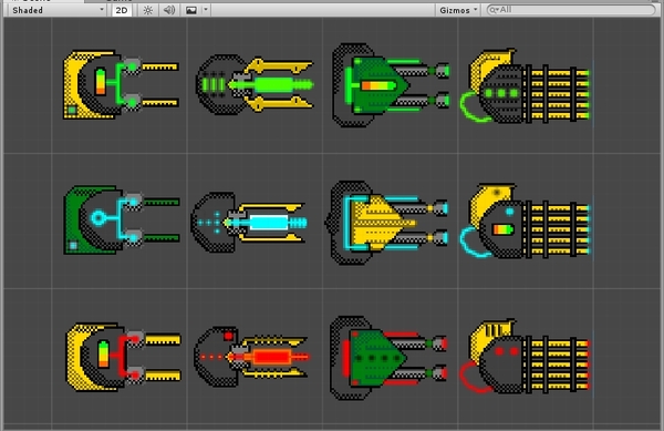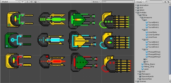 За неимением художника приходится самому постигать науку пиксель-арта... Не могу сказать, что успешно, но что-то из нарисованного мне даже нравится. Закончил с мини-набором вооружения для демонстрационной версии. Осталось нарисовать пару корабликов, щитовой генератор и двигатель...