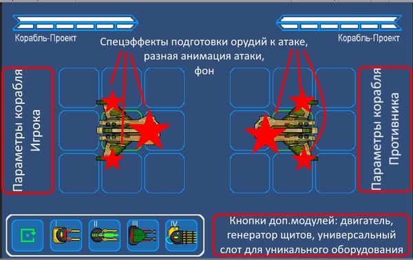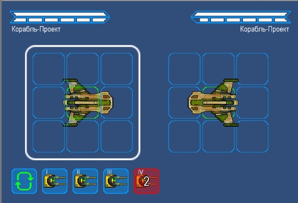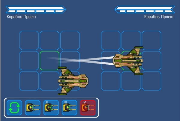 Это ранняя версия Фазы Атаки. Оба корабля (слева игрок, справа - противник) на стартовых позициях. Кнопки вооружения "подсвечены" белым.