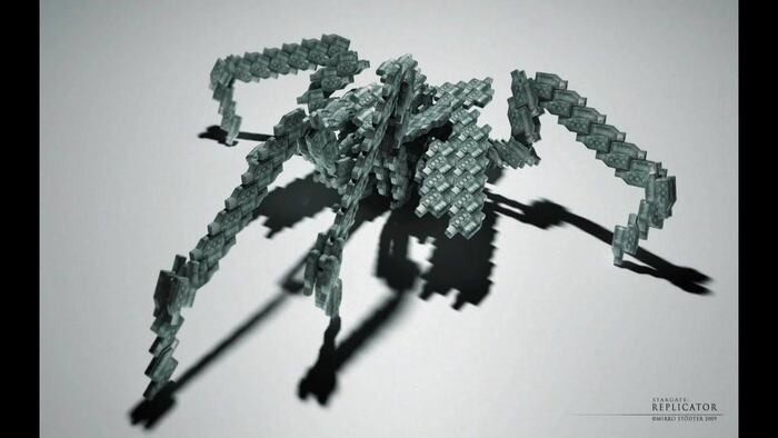 Мы хотели создать противников, которые будут запоминаться. Один из вариантов, которым мы вдохновлялись — это Репликаторы из сериала "Звёздные врата". Нас зацепила идея того, что роботы состоят из небольших блоков, позволяя им пересобираться и образовывать более сложные конструкции. Нам очень понравилась идея модульности робота вкупе с простотой визуальной части. Ну и ещё чуть-по-чуть они внушают страх, когда видишь их в первый раз, и требуют от игрока сосредоточенности в бою.