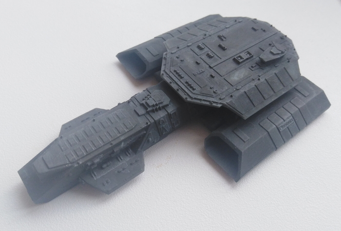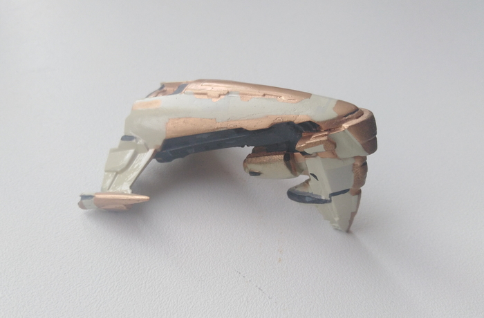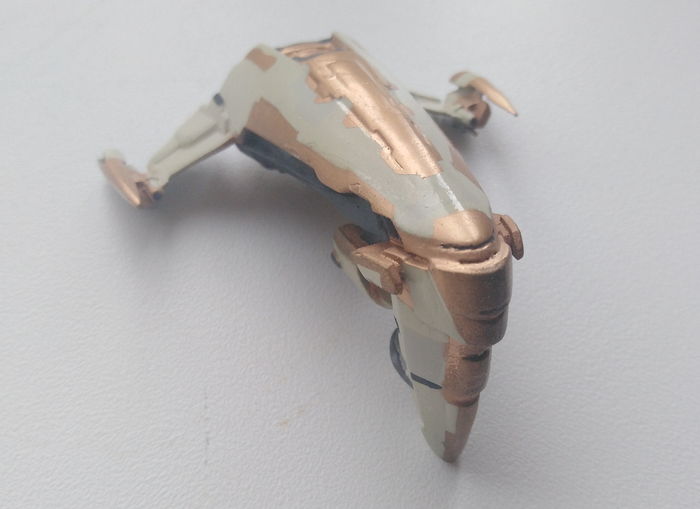 Яхта Нубиан из Звездных Войн 2 эпизод. Она же есть уже распечатанная нормального размера, там уже буду делать всё старательно, тут просто тестировал краску. Поверхность нужно будет обрабатывать чертовски тщательно для такой поверхности... 3d модель кстати нарисовал сам, с расшивкой, но в таком масштабе не пропечаталось.